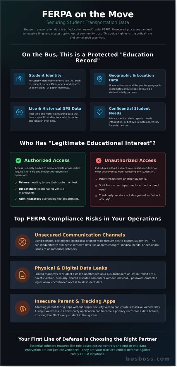 When school districts consider data security, the focus is often on student information systems and classroom data. However, the school bus is a mobile extension of the educational environment, and the data it generates is equally protected. The Family Educational Rights and Privacy Act (FERPA) is a federal law that protects the privacy of student education records, and this protection extends far beyond the school building. Understanding how FERPA applies to transportation is the first step in mitigating significant financial and reputational risks associated with a data breach.