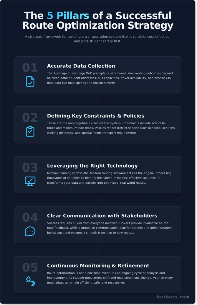 Before a single route is drawn, a successful strategy must be built on a solid foundation. Effective route optimization for schools isn't just about software; it's a methodical process resting on five interconnected pillars. Overlooking any of these can compromise safety, efficiency, and budget. This strategic framework helps districts build a transportation system that is reliable, cost-effective, and puts the safety of their precious cargo first.