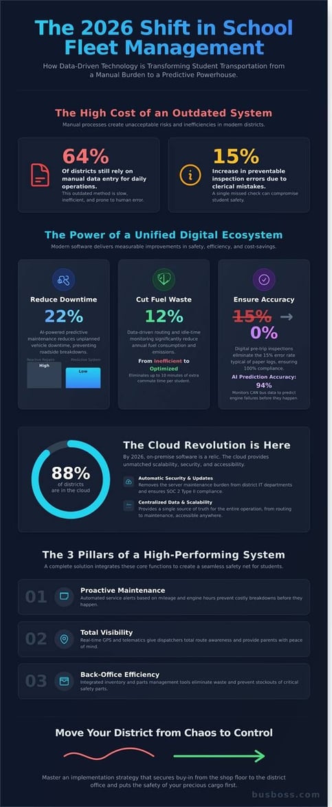 Cloud-based platforms have officially overtaken on-premise garage software, with 88% of North American districts migrating to the cloud by the start of the 2025-2026 school year. This shift allows for automatic security patches and instant scalability. It removes the burden of server maintenance from overstretched IT departments. By centralizing data, districts can finally see the full picture of their operations. This transparency leads to better budgeting, improved driver retention, and a safer environment for every student on the bus.