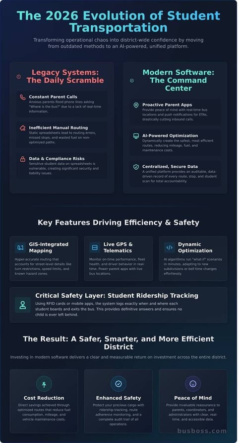 The morning bell is about to ring, but your phone is already ringing off the hook. Anxious parents want to know where the bus is, a driver has called in sick, and you're trying to re-route a path using fragmented, outdated systems. This daily scramble is a high-stakes reality for transportation coordinators, but it doesn’t have to be. The right student transportation software is designed to transform this operational chaos into confidence, ensuring the safety of your district’s most precious cargo.